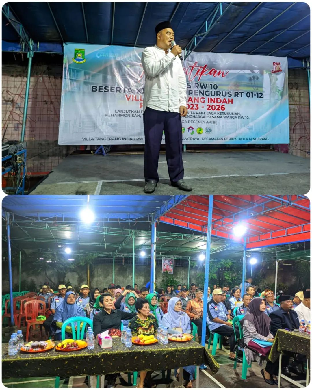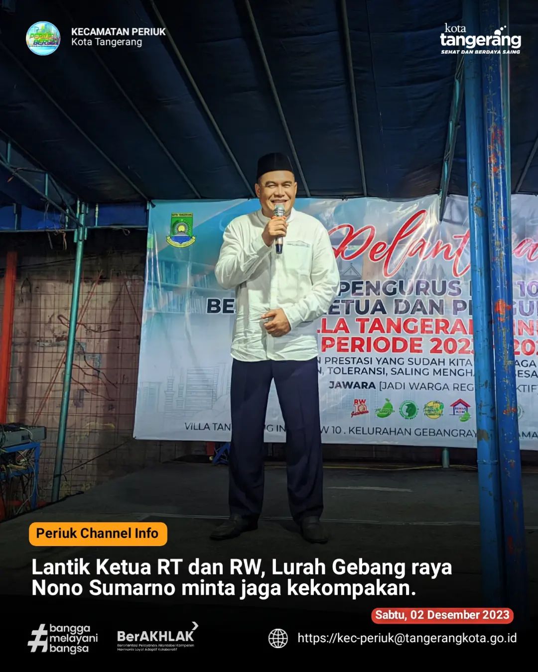 Lurah Gebang raya Nono Sumarno, resmi melantik pengurus RT dan RW 10 masa bakti 2023-2026. yang berlokasi di Villa Tangerang Indah RW. 10 Kelurahan Gebang raya kecamatan periuk. Sabtu, (02/12).